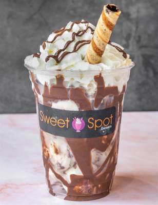 Layers of peanut butter and vanilla ice-cream with crushed snickers, Laced with milk chocolate sauce. Topped with a swirl of freshly whipped cream and a wafer. |