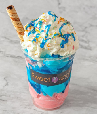 Bubble gum ice cream layered with skittles and covered in bubble-gum sauce. Topped with freshly whipped cream and garnished with sprinkles. |